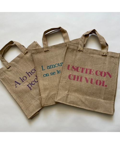 ナチュラルなジュート素材にカラーロゴが映えるトートバッグです。 スタイリングに合わせやすいシンプルなフォルムで、たっぷりと入るサイズ感なので機能性も◎ メインバッグとしてはもちろん、サブバッグとしても活躍してくれます♪ 持っているだけでシーズンムードが高まるアイテムです。 ◾️カラー ピンク・ブルー・パープル ◾️サイズ 約W:34cm×H:38cm×D:13cm ハンドル:約38cm ※多少の誤差は予めご了承ください。 ◾️素材 植物繊維(ジュート) ※ジュートバッグは麻の一種であるジュート繊維で作られたバッグです。 麻素材は天然素材なので、むらや色合いの違いがあります。 不良品ではございません。