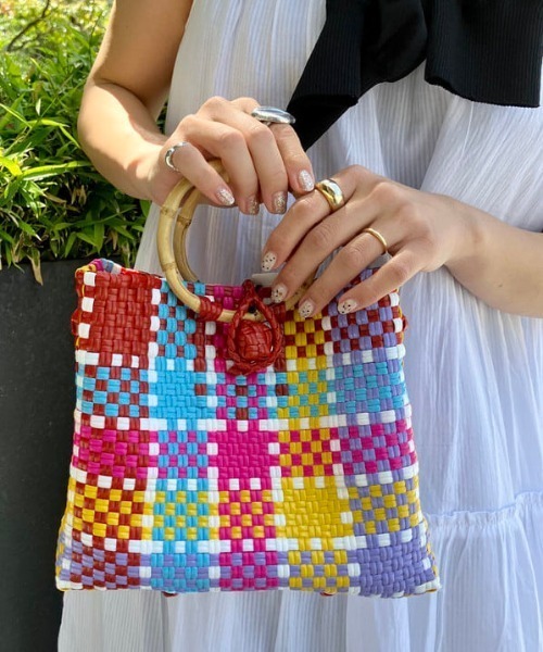 シーズンムードをプラス■デザイン持ち手のバンブー素材とインパクトのある柄が目を惹くバッグです。柄のカラーコンビネーションを〈Ray BEAMS (レイ ビームス)〉が別注したスペシャルなアイテム。普段のコーディネートにプラスワンで洗練された印象を演出してくれるひと品です。■コーディネートデニムやワンピースなど様々なスタイリングに◎。デイリーユースはもちろんリゾートやレジャーシーンにもおすすめです。■ディテール内ポケット無し。広めのマチと収納力もあり自立する立体的なシルエット。■サイズ長財布や携帯、ポーチなどが入る大きさ。350mlのペットボトル収納可能。横向きであれば500mlのペットボトル持ち運び可。■素材リサイクルプラスチック素材。■メーカー番号BW-SS23-041※光の当たり具合やパソコンなどの閲覧環境によって実際の色味と異なって見える場合がございます。予めご了承ください。※商品の色味は商品単体で撮影した画像をご参照ください。BALI WERKSTATTE / バリ ワークスタットバリの伝統的なハンドクラフトの技術にモダンな要素を融合し、洗練されたデザインが特徴のライフスタイルブランド。ブランド名はファウンダーの故郷ウィーンにある“WIENER WERKSTATTE”という現地のクリエーターコミュニティが由来。素材、製法のスペシャリストのそれぞれのアトリエで作られる個々のアイテムが集結して、1つのコレクションを創造しています。