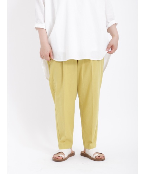 接触冷感・抗菌の機能素材を使用しています。 前はウエストのタックから柔らかく続くセンタープリーツ風のラインが入っていて、スッキリ見えるテーパードシルエット、後ろはギャザーが入っていてゆったりとしたカジュアルなシルエットです。 キレイ目過ぎず、カジュアルに履けるパンツです。※商品画像は、撮影環境やお客様のご利用のPC・スマートフォンのモニター環境などにより実物と色味に差異がある場合がございます。【その他採寸】F ウエスト:[後ゴム仕様]68cm