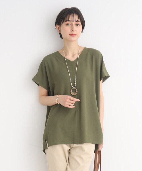 【デザイン】 ゆるVネックできれい目になり過ぎず、ボトムのON/OFFスイッチで着用シーンも幅広い1枚。 身体から程よく離れるシルエットなので、夏に一枚でデイリー使いするのに便利です。 一見シンプルなカットソーのようですが、程よい重みのある落ち感で着用時のシルエットがとても綺麗なのもポイントです。 ワイドパンツ(C62-66010)と同素材なので、セットアップで着ていただけます。 【素材】 軽量で、通気性が良く、シワになりにくい。 触れた瞬間ひんやりする接触冷感機能付きの素材を使用しております。 モデル情報:身長168cm B76 W58 H86 着用サイズ:00(FREE) 店舗へのお問い合わせ商品番号:C62-16029 ●製品寸法: 00(FREE):着丈75cm B136cm 裄丈38cm 肩幅73cm 備考: