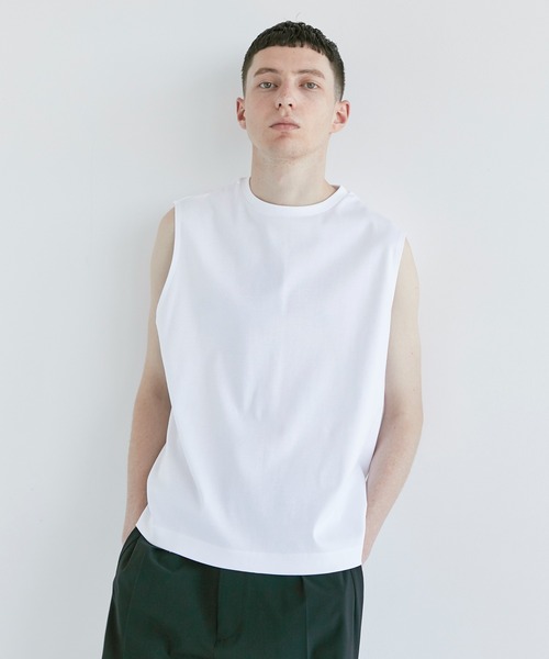 〈素材〉 ・インドで手摘みした希少な超長綿(スビンコットン)を使用。 ・特殊プレミアムシルケット加工を施すことによりシルクの様な光沢感とハリのある風合い、形態安定性のある生地。 ・伸縮性が高く、肌に優しいフライス組織。 ・透け感:なし・ 伸縮性:あり・ ・裏地:なし 〈デザイン〉 ・ゆったりと着用できるリラックスフィット。 ・希少な素材、特殊な製法、加工による上品な光沢感と着心地の良さが最大の特徴。 ・夏のインナーとして大活躍のノースリーブTEE。