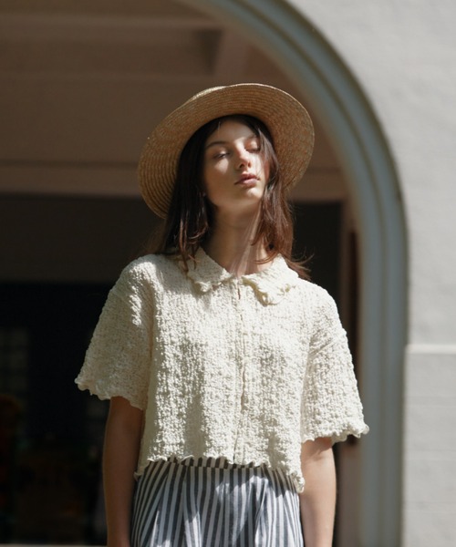 EDIT Gris/エディットグリ 【襟付きショート丈カットジャガードカーディガン】 凹凸のあるテクスチャーに古着屋で探し当てたようなキッチュな昭和っぽさが漂う、クロップド丈の半袖トップス。 ボレロのようなルックスが愛らしく、ボタンを留めればシャツ見えするデザインが◎。 伸縮性のあるジャージ素材なので、どんなインナーとも合わせやすい1枚。 ■POINT ・シボ感のあるカットジャガード生地 ・前開きデザインなので、1枚着としても羽織としても着用可能 ・伸縮性のある生地を使用している為、身動きが取りやすい ■STYLING カーゴパンツなどのメンズライクのアイテムと合わせることでカジュアルさを演出! スカートなどの女性らしいアイテムはもちろん、ルーズなデニムとの相性抜群◎ ボタンを開けてインナーに柄物を入れるだけでおしゃれな雰囲気に。 ------------------------ 透け感/WHTのみあり 伸縮性/あり 厚 み/普通 ------------------------ 詳しいお手入れ方法は洗濯表示をご参照ください。 ※ご注意※ ・屋外の光や照明の当たり具合で、実際の商品の色味とカラー別画像の色味に若干の違いが発生する場合がございます。 ・詳細画像と併せてご確認の上、ご注文いただきますようお願い致します。 【EDIT Gris/エディット グリ】 “ Enjoy my own FASHION ! “ Grisはグレーカラーを意味するフランス語。 さまざまな色が混じり合って生まれる「グレー」というカラーに 「他人色に染まらない、自分の愛するスタイルを自由に楽しむ」女性のイメージを重ねました。 そんな女性にとって、いくつものコーディネートアイデアが浮かんでくるような「エディット可能」なラインナップで、 ちょっとクセのあるシンプル&ベーシックスタイルを提案します。 【商品のお気に入り登録】 完売カラーの再入荷通知やラスト1点の通知 プライスダウンの通知も受け取ることができます。 ぜひご登録ください。 【ブランドのお気に入り登録】 新商品や再入荷など、 ブランドの情報をいち早くお知らせします! ぜひご登録ください。