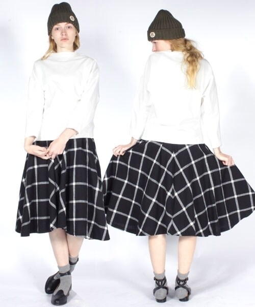 ●お届け予定 : 2015年2月下旬※こちらは予約商品になります大きめの格子柄チェックを載せた綿麻素材のフレアスカートです。縫い目・継ぎ目をを左脇にずらして、柄がイレギュラーに見える仕様です。全体にボリューム感があるシルエットなので、シンプルなトップスと合わしても存在感のあるデザインに仕上げています。 Model:身長 168 cm 着用サイズ:Mサイズ