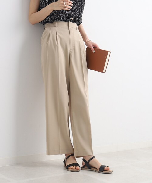 【デザイン】程よいワイドシルエットのパンツは、ストンと落ちるきれいな素材感で、体型もさりげなくカバー。トップスの前をインしても品よく見えるように、ウエスト部分にタックを入れたデザインになってます。洗練されたルーズさでラフに履きこなせる形のワイドパンツで、カジュアルにもモードにも着こなせる一枚です。※ポケット数:横×2 後ろ(ダミー)×2【スタイリング】程よいワイドシルエットなので、シャツやカットソーをタックインしてオフィススタイルもこなれた印象に!ゆったりとしたシルエットのカットソーを合わせてもカジュアルにも着まわせます。【素材】TRPUというレーヨン入りの素材で柔らかく、上品な印象の素材感です。※後ろウエストゴム仕様※裏地なしこちらの商品は主に夏に着用いただける商品です。モデル情報:身長168cm B76 W58 H86 着用サイズ:02(M)店舗へのお問い合わせ商品番号:C62-66018●製品寸法:02(M):W70~76cm H90cm 股下67cm 前股上32cm 渡り幅32cm 裾幅24cm03(L):W72~78cm H96cm 股下68cm 前股上33cm 渡り幅34cm 裾幅26cm備考:
