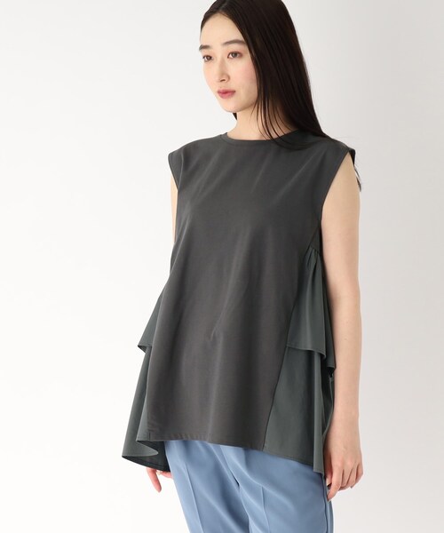 一枚で着映える、ティアードドッキングデザイントップス【デザイン】・カットソー素材とシャツ素材をドッキングさせた、異素材切り替えのデザイントップス。・すっきりとしたノースリーブに、ティアードを組み合わせたボリューム感がポイント。・細身のパンツやデニムなどのカジュアルパンツとの組み合わせがおすすめです。【素材】・コットン(綿)とポリエステルの混紡糸を使用した取り扱いのしやすいカットソー素材に、シャツ素材を組み合わせた異素材トップス。・ご家庭でお洗濯が可能な機能性もうれしいポイントです。・イージーケア機能付きで、取り扱いのしやすいところも嬉しいポイントです。こちらの商品は主に夏に着用いただける商品です。モデル情報:身長168cm B76 W58 H86 着用サイズ:38(M)店舗へのお問い合わせ商品番号:637-16238●製品寸法:36(S):着丈70cm B90cm 肩幅41cm38(M):着丈71cm B93cm 肩幅42cm40(L):着丈73cm B96cm 肩幅44cm備考: