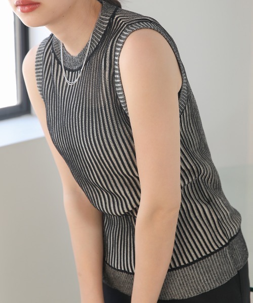 ●Bab● ■POINT デザインリブが目を惹くノースリーブニットトップス。 縦のラインを強調してくれるストライプ柄のノースリーブニットトップスは、シンプルながらも着映えするアイテムです。 ネックラインやアームホールを単色で切り替えているため、メリハリのある印象に。 トップスインもアウトもスマートにきまる着丈が魅力的です。ノースリーブなので、ジャケットやカーディガンとのインナーとしてチラ見せして着用しても◎シンプルなアウターにアクセントをプラスできます。 ■FABRIC リブ素材で伸縮性があり、程よく身体にフィットし、華奢見せしてくれます。 ■COORDINATE 編地が印象的でシンプルコーデに華やかさをプラスしてくれます。程よいフィット感のあるデザインなのでデニム等と合わせたカジュアルスタイルと相性抜群。きちんと感のあるボトムスを合わせたきれいめスタイルもおすすめです。 キャミワンピースのインナーにもストライプをワンポイントで合わせてコーデにアクセントをつけるのもおすすめ! ………………… 透け感:多少あり 裏地:なし ………………… ※撮影環境により、多少実際のカラーと異なる場合がございます。また、携帯やスマートフォン、パソコンなどの画面上と実物では多少色が異なって見える場合がございます。ご了承下さいませ。 ※画像の商品はサンプルのため、実際の商品と若干仕様が異なる場合がございます。 ※濃色品は、過度な摩擦や濡れた状態での摩擦により、色落ち・色移りをする恐れがあります。 ※この商品は、素材の特性上、洗濯の際に多少の縮みが生じる恐れがあります。洗濯後は形を整えてから干してください。 ※その他お取り扱いに関しましては、商品に付属のアテンションタグをご覧ください。 ★商品のお気に入り登録 再入荷やラスト1点のお知らせ、セール情報などお知らせを受け取ることができます! ★ブランドのお気に入り登録 新商品や再入荷などのお得な情報を受け取ることができますので、是非ご登録ください。 ★Bab公式Instagramアカウント【bab.showroom】で最新情報をチェック!