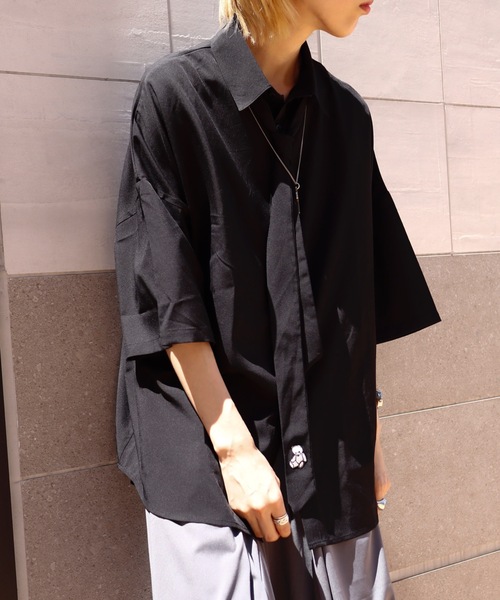 【"MGO"プロダクト】DARK BEARSHIRT SS with TIE付属のネクタイの先端に刺繍された人気キャラクター"DARK BEAR"がチャームポイント【素材】さらりとした、ストレッチ性のポリエステル素材を使用。【ディティールetc】■"DARK BEAR"刺繍のネクタイ付き■ドルマンシルエット【コーディネート】ネクタイがセットで付いてくる、オーバーサイズ シャツ。ネクタイは取り外し可能なので、日によって異なった着こなしをお楽しみ頂けます。単品でも主役級のアイテムなので、シャツにワイドパンツやスラックを合わせるだけでもスタイルが決まります。