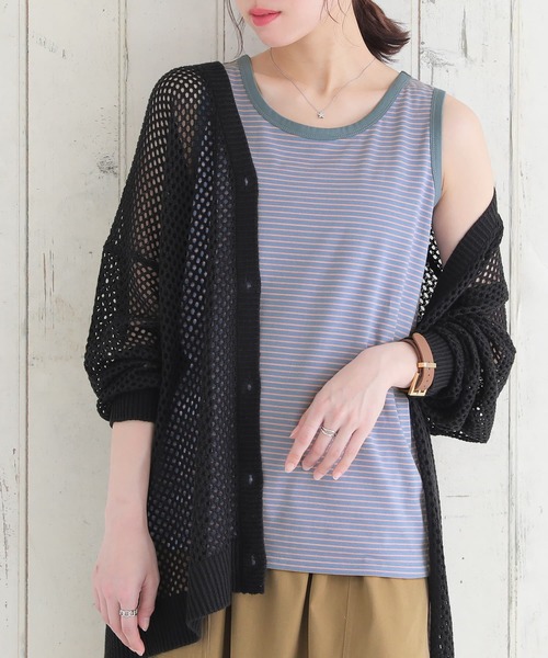 配色ボーダー×パイピングデザインで、シンプルなのにお洒落見えするタンクトップ。 一枚ではもちろん、無地アイテムやシアーシャツなどから覗かせてコーデのポイントに♪ 襟ぐり、アームホールのバインダー始末を少し太めにすることで、 インナー見えせずに1枚でも着用しやすいデザインにしました。 肌触り柔らかなコットン混の天竺カットソーを使用。 やや薄手の生地で、これからの季節に活躍する軽やかな素材感が特徴です。 インナーに1枚入れるだけでコーデが華やぐ、≪n'OrLABEL≫細ボーダー柄パイピングタンクトップです。