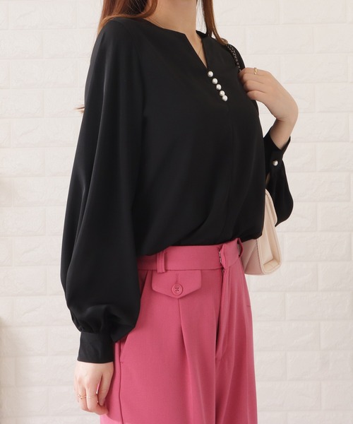 パールボタンキーネック長袖ブラウスボディラインをゆったりと覆う、とろみ素材の長袖プルオーバー。顔まわりをすっきりと見せてくれるキーネックには、パールボタンをあしらうことで上品な佇まいに仕上げました。ボリューム感たっぷりのオーバーサイジングに仕立てたコンシャスな袖にも注目。気になる二の腕まわりをしっかりとカバーしてくれるので、細見え効果も期待できます。シンプルなデザインなので、合わせるボトムを選ばないのもポイント。カジュアルなボトムにさらりとオンするのはもちろん、きれい感のあるルックスでオフィスコーデにも重宝します。バリエーションはベーシックな4色展開でご用意しています。<注意点>・色合いはモニター環境により若干の誤差が出ます。・サイズは測り方により若干の誤差が出る場合がございますが、予めご了承ください。・入荷・生産時期により、色、サイズ、素材など多少異なる場合がございます。・本製品は生産過程におきまして、生地を織る際の糸の継ぎ目や多少のほつれが生じることがあります。・簡易包装となっており、保管・梱包時にシワが伴う場合がございます。