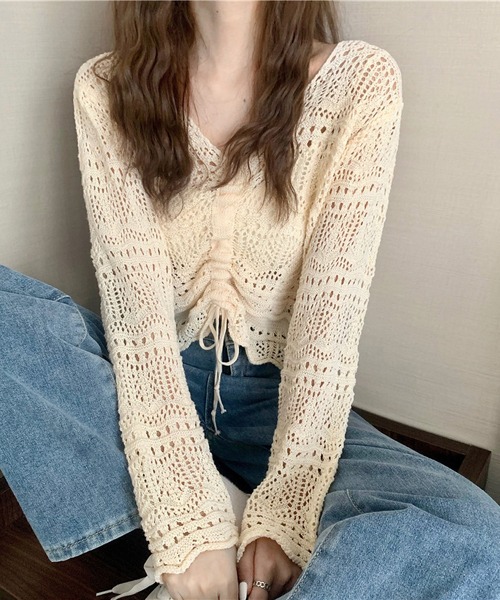 《今年らしい凝ったクロシェ編みトップス》■デザイン・上品なレースのような編み柄が目を惹く、透かし編みトップス。・透け感のあるクロシェ編み風の編み柄が今っぽい雰囲気で着れます。・フロントのギャザーリボンの絞り方によってアレンジも可能です。■素材サラッとした軽い着心地で、サマーニットとしても活躍。インナーを変えて、長いシーズン着回せます。■スタイリングパンツにもスカートにも合わせやすい丈感です。インナーにカラーインナーを合わせるてもカワイイです。※店頭及び屋外での撮影画像は、光の当たり具合で色味が違って見える場合があります。またご覧いただきますモニターや使用環境により実際の商品と多少色味が異なって表示される場合がございます。予めご了承をお願いいたします。★商品のお気に入り登録→【カートに入れる】右側の♡をクリック完売カラーの再入荷通知や、ラスト1点の通知、セールの通知も受け取ることができます。★ブランドのお気に入り登録→ブランドタグのページからお気に入りをクリック新作商品や再入荷などブランドのお得な情報を受け取ることができます。※ご注文いただいた予約商品のお届け時期の確認は、注文履歴ページより行えます。※他のキャンペーンにより、期間中に価格が変動する場合がございます。※セールは予告なく終了させていただく場合がございます。