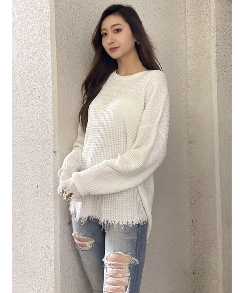 さらっとワッフルニットが着心地抜群♪■商品コメント袖と裾のダメージがポイントのニットトップス。 さらっと、やわらかいワッフルニットが着心地抜群。ゆったりとしたサイズ感で、 長めチュニックの着丈なので腰回りもカバーできます◎ シンプルなデザインなので、どんなボトムにも合わせやすい万能アイテム。■コーデフェイクレザーのレギンスや、ミニボトムでチュニックのように着用がおススメです。【 お買いものにおすすめの便利機能! 】♥商品のお気に入り登録完売カラーの再入荷時や、ラスト1点の時、セール開始時にお知らせします。♥ブランドのお気に入り登録新商品や再入荷、セール情報など、いち早くブランドのお得な情報を受け取ることができます。ぜひご活用ください!