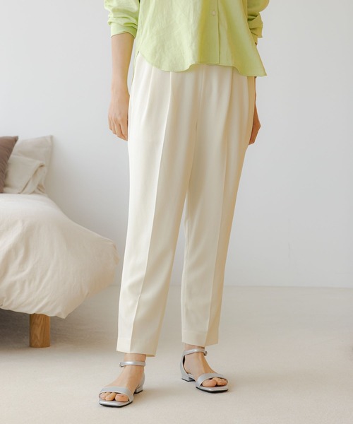 夏を乗り切る強い味方!サラサラサマ―シリーズ解禁! 機能素材で夏もサラサラ快適テーパードパンツ2023! 適度な素材感のポリエステルジョーゼットは速乾性があるので汗ばむ夏もサラサラ快適な履き心地が続きます。 家庭でのイージーケアにも対応できるのでデイリー使いにぴったりです。 接触冷感性で脚入れもひんやり。 汗をかきやすいシーズンに手放せない1枚です。 ウエスト周りはゴムでストレスフリー&おなか回りをしっかりカバーしつつ、裾にかけてのテーパードシルエットで美脚も叶う、ON,OFF着れるキレイ目パンツです。 豊富なカラーバリエと、同シリーズのワイドパンツもおすすめです。 【素材】 ・サラサラとした肌触りと速乾性のある素材で汗をかいても快適 ・接触冷感機能で涼しいが続く ・秋まで着れるシーズンレス素材で着回し力抜群 ・麻見えなのに合繊素材なのでシワを気にせずに着れてイージーケアでお手入れも楽ちん 【悩みに“効く”ポイント】 ・ウエストゴムでストレスフリーな履き心地&おなか回りをカバー ・裾にかけてのテーパードシルエットでスッキリ美脚効果 【お手入れについて】 洗濯:洗濯機可 タンブル乾燥:不可 漂白:不可 自然乾燥:日陰のつり干し アイロン:120℃まで可 クリーニング:可 ※詳細は製品のタグ情報をご確認ください。 ------------------ ・透け感:やや透ける ・伸縮性:あり ・生地の厚さ:普通 ・裏地:なし ※こちらは参考情報となります。カラーにより多少の誤差がございます。 ------------------ ------------------------ 【お気に入り登録のおすすめ】 ■商品のお気に入り(♡)登録 ┗完売カラーの再入荷通知や、完売間近の通知、ZOZO店のみのセールなどの通知を受けることができます。 ■ショップのお気に入り(♡)登録 ┗新商品や再入荷など、いち早くブランドのお得な情報を受け取ることができます。 ------------------------
