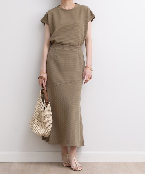 【夏のセットアイテム】ラクしてもキレイに決まるZOZO限定セットアップ ●もうコーディネートを悩まない! ●楽しても上品さを欠かせない! ●忙しい朝でも時短を叶える! ◆素材 ポコポコした畝が特徴のリップルを使用。凹凸があることで肌に触れる面積が少なくなりため、肌に張りつきにいくい素材です。さらりとした肌触りで通気性が良く、暑さが続く季節に適しています。ご自宅でお洗濯できるものもうれしいポイントです。 ◆デザイン 【華奢見えフレンチスリーブトップス】 シンプルなクルーネックにボクシーなシルエットでスタイリングの幅が広がる1着。二の腕カバーのフレンチスリーブデザインの夏トップス。 【美ラインフレアロングスカート】 斜めの切り替えがポイントで、アクセントになるだけでなくヒップや腰回りがスッキリ見える美ラインシルエットを実現。両サイドにはポケット付き、ウエスト後ゴム仕様でストレスなく穿いていただけます。サンダルやスニーカーに合わせやすいレングスのフレアスカート。 ◆コーディネート そのままセットアップでのワンピース見えコーデはもちろん、トップス、スカート別々でも使いやすいセットアイテムです。きれいめなセットアップはオフィスシーンでも大活躍すること間違いなし。 ************************** 透け感:アイボリーややあり 伸縮性:あり 裏地:なし 光沢:なし ポケット:スカートのみあり スカートウエスト:後ろ部分ゴム仕様 洗濯方法:水洗い可 **************************