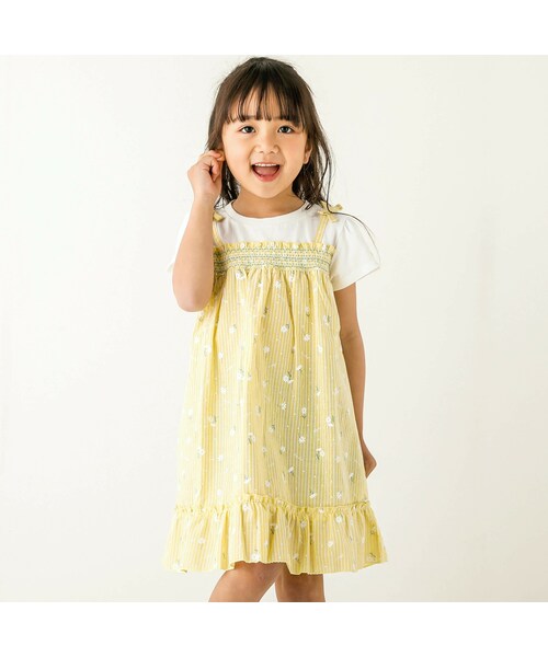 ストライプ生地に花柄をほどこしたキャミソールワンピを半袖Tシャツにレイヤードしたワンピース。 春夏のお出かけが楽しくなる1着になっています。 同じ生地を使用した花プリントストライプシリーズの展開があるので姉妹のシミラーコーデも可能です◎ お揃いコーディネートで家族のお出かけが楽しくなること間違いなし! 【キッズ】 ワンピース(1801-53064) Tシャツ(1815-53092) ショートパンツ(1810-53053) 【ベビー】 ロンパース(1822-53012) スタイ(1834-53004) 同じストライプ生地を裾口の折り返しに使用したベビーの男の子用Tシャツ(1837-53108)も展開しているのでさりげないシミラーコーデを楽しみたい場合はこちらもオススメです。 さわやかなブルー系と元気いっぱいなイエロー系の2色展開です。 ※バスト寸法は、多少の誤差が生じる事がございます。あらかじめご了承下さい。 ※柄の出方は生地の裁断により一点一点異なります。 2023年春夏女の子アイテム 【 2023年 4月のテーマ / My fave Pattern festa 】 いきもの柄、花柄、サファリ柄、フルーツ柄・・・ 推し柄で夏の陽気を楽しもう◎ カラーもワントーンアップしてパッと目をひくコーデでゴールデンウィークや春夏のおでかけをエンジョイ! 【 2023 SPRING / SUMMER Fresh Up! 】 ベーシックがいいけど新しいものが欲しい! 何かちょっと違うかわいく、ときめく部分が欲しい! 2023年の春夏はときめきを具現化させたベーシックだけどおニューなアプデ商品を展開します。 【SLAP SLIP(スラップ スリップ)】 ~子どもの欲しいをカタチに~ ヨーロッパのこどものように 子どもらしい今しか着れないナチュラルなかわいさを提案 どこか上品で清楚感漂うフレンチカジュアルは いつものコーディネートをさりげなく格上げ