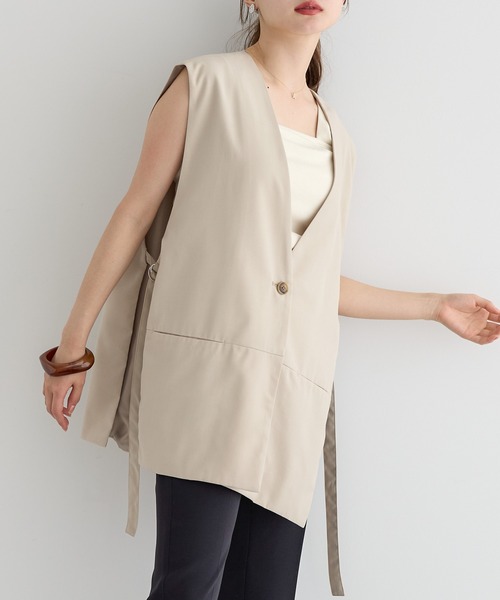 ■デザイン・サイドベルトがアクセントになったオープンデザイン。・スリット風のデザインがポイント。・やや長めの着丈で気になる腰回りをカバー。・ベルト部分は調整可能なので、インナーの見せ方に変化を付けられます。■素材・上品な落ち感のある素材感■カラー・顔周りを明るく見せるライトベージュ。・万能なブラック。【洗濯表示】40℃以下の手洗い可/漂白剤使用禁止/タンブル乾燥禁止/日陰つり干し/150℃以下のアイロン仕上げ可/弱い石油系ドライクリーニング可透け感[無し] 裏地[すべて有り] 伸縮性[無し] 光沢感[無し] 生地の厚さ[普通] 付属品[無し] ポケット[有り]前2つ●製品寸法:M:バスト52cm 着丈70cm 肩幅48cm 裾幅50cmL:バスト54cm 着丈72cm 肩幅49.5cm 裾幅51cm備考: