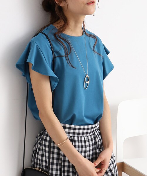 【デザイン】 上品見えの素材にお袖のフレアが魅力的なトップス! お袖のフリルが可愛らしい印象ながら、さらりとしたキレイ目素材が大人っぽさをプラスしています。 首回りはラウンドネックで、バックボタンはゴールドボタンでアクセントになっています。 お袖周りはゆったりですが、腕を上げた時にインナーが見えにくい仕様になっています。 さらりとした肌触りで締め付け感もなく、暑い時期のお出かけ等にも着ていきたくなる1枚です。 【スタイリング】 Tシャツのようにさらりと着られるのに きちんと感あるスタイルにキマる大人のトップス。 フレアカートと合わせるとフェミニンに、 ナロースカートと合わせるときれい目スタイルに見せてくれます。 キャミワンピースのインナーとしても◎ パンツ派の方は テーパードシルエットをチョイスするとすっきりスタイリッシュなコーデに見せてくれ、オフィスカジュアルにもおすすめです。 【素材】 触れた瞬間ひんやりする接触冷感機能付き。 落ち感のある滑らかで品のあるレーヨン混生地です。 ※オフホワイト(003)はやや透け感があるため、インナーの着用をおすすめします。 こちらの商品は主に夏に着用いただける商品です。 モデル情報:身長164cm B78 W56 H80 着用サイズ:02(M) 店舗へのお問い合わせ商品番号:741-16330 ●製品寸法: 02(M):着丈59cm B98cm 肩幅45cm 03(L):着丈61cm B101cm 肩幅46cm 04(LL):着丈63cm B104cm 肩幅47cm 備考: