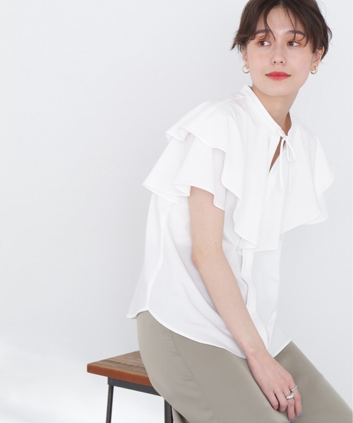 多数のリクエストありがとうございます!皆様の声にお応えして、追加生産決定! 大きなラッフルで華やかな存在感を叶えるブラウス。肩まわりを覆ったラッフルは後ろまで配置され、身頃のセンターには切り替えを入れて、甘い印象になりすぎないデザイン。襟元のカットラインに細リボンでアクセントをつけ、一枚で着やすい二の腕をカバーする袖丈も魅力。キレイめなスカートやパンツスタイルはもちろん、デニムパンツとのカジュアルな着こなしにもオススメです。ご自宅でお洗濯ができ、デイリーに気兼ねなくご利用いただけます。※お洗濯の際は、付属の注意書きや商品についている品質表示をご確認いただきますようお願いいたします。【Designer's Voice】肩周りのラッフルが華やかなブラウスです。フロントとバック中心に入るタックもデザインポイントです!【Fabric】中薄手のTRスパン**********************透け感:ややあり裏地:なし伸縮性:ややあり光沢感:なし生地の厚さ:普通**********************※こちらの商品は【 ラッフルブラウス/166-3110505】同型・同素材のお品物になります。【N. ECstaff 着用コメント】身長:160cm/体型:普通/普段サイズ:M/着用サイズ:M生地は厚すぎずサラッとしていて、少し伸縮性もあるので夏でも着心地がよく着やすいです!自宅で洗濯がきるので、汗ばむ季節でもデイリー使い出来るのもポイントです!肩回りのラッフルが女性らしさを出してくれるので一枚でサマになるのがうれしいです!程よい丈感なのでアウトしてカジュアルにデニムに合わせにしたり、インしてきれいめなスカートと合わせたりできるのでコーデの幅が広がります♪