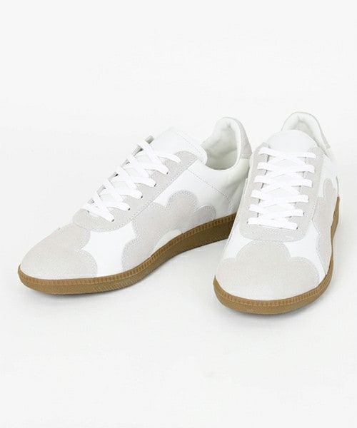 フラワーアーミートレーナー。 ジャーマントレーナーをフラワーモチーフでアレンジしたスニーカーです。 インソールは立体形状のポリウレタンインジェクションソールを使用することで、 フィット感に優れ、高いクッション性により足への負担を軽減します。 なめらかな表面で柔らかく馴染みやすいスムースレザーをアッパーのベース部分に使用しています。 毛足が短く繊細できれいな表面のベロアスエードをフラワーモチーフ、シューホール、ヒールに使用しています。
