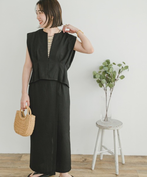 深めのVネックデザインが大人ライクな印象のノースリーブトップスとラップ調デザインのタイトスカートを組み合わせたセットアイテム。名前の通り、不快感のないサラッとしたドライタッチ生地を使用したシーズンライクなアイテム。トップスはタックを施したまとまりのあるスッキリシルエットがポイント。スカートはスタイルアップ効果に期待のハイウエストデザインで、お手持ちのブラウスなどと組み合わせてオフィスシーンにも取り入れやすいですよ。 【2023 Spring/Summer】 ※商品画像は、光の当たり具合やパソコンなどの閲覧環境により、実際の色味と異なって見える場合がございます。予めご了承ください。 ※商品の色味の目安は、商品単体の画像をご参照ください。 ▼お気に入り登録のおすすめ▼ お気に入り登録商品は、マイページにて現在の価格情報や在庫状況の確認が可能です。 お買い物リストの管理に是非ご利用下さい。 素材感 透け感 : ややあり(トップスのみ) 伸縮性 : なし 裏地 : あり(スカートのみ) 光沢 : なし ポケット : なし