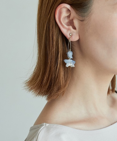 繊細に揺れるお花がエレガント。耳元華やぐ夏のイヤリング。【素材感】・さかなのうろこを洗浄、乾燥させて染色したサステナブルな繊細パーツ。・軽く、ストローのような感触の素材感。【デザイン・シルエット】・クリアなフラワーモチーフが揺れるイヤリング。・着け外しがしやすいクリップタイプ。【カラー】・ブルー、クリームイエローの柔らかな2色を展開。【スタイリングポイント】・花柄ワンピースに合わせて季節感を楽しんで。・ヘアスタイルはタイトにまとめるとイヤリングがぐっと映える。・同シリーズでネックレス(品番:GIZ13220)も展開しているので、合わせて取り入れるのもおすすめ。※撮影時の光、お使いのモニター環境によって色の見え方が違う場合がございます。※天然のものになりますので、サイズの大小や色ムラがございます。乾燥した場所での保管をお願いいたします。