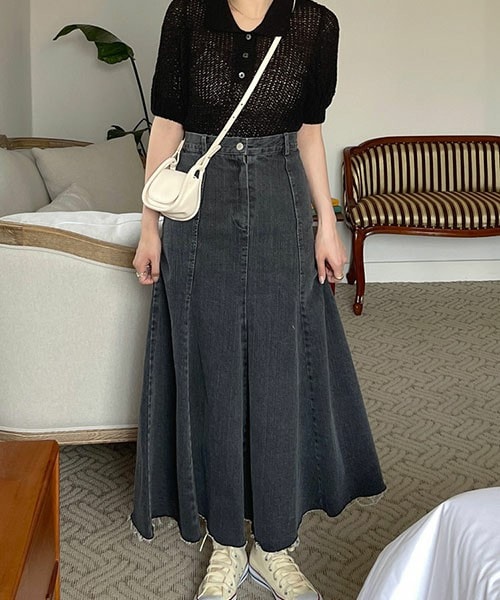 裾がカットオフされたデザインがかわいいデニムスカートは、 ヒップ周りから裾にかけて広がりがある揺れ感とシルエットがかわいいです💓 スニーカーやサンダルと合わせてカジュアルに合わせてもかわいいし、秋口はブーツと合わせてもかわいいです✨