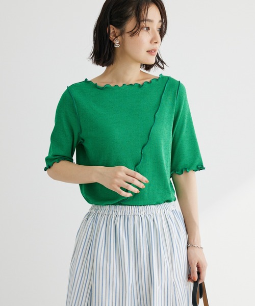 バイカラーのメローフリルが愛らしいアクセントをプラスするプルオーバー。 顔周りをすっきりと見せてくれるネックラインもポイント。前後どちらでも着用することができる2WAY仕様で異なる表情を楽しむことができます。 伸縮性のあるリブですっきりと着ることができ、デイリーユースにも活躍してくれるアイテムです。 透け感[やや有り] アイボリーは[有り] 裏地[無し] 伸縮性[有り] 光沢感[無し] 生地の厚さ[薄手] 付属品[無し] ポケット[無し] ●製品寸法: F:バスト44.5cm 着丈59cm 袖丈28.5cm 肩幅35cm 裾幅45cm 備考:
