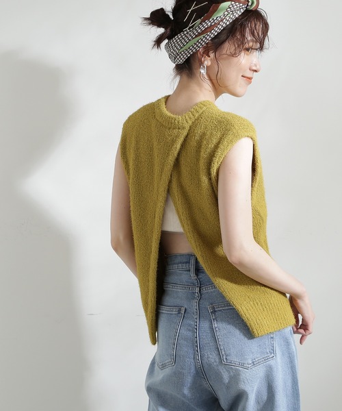 ふんわり起毛したニットタンクは、後ろをクロスさせたスリットデザインで抜け感のあるポイントを作る一枚。インナーにはお手持ちのキャミソールやタンクトップなどを合わせて、レイヤードしていただくのがオススメです。前はシンプルながらも、後ろにデザインが効いたバックコンシャスなアイテムは、スカートにもパンツにも相性バツグンです。**********************透け感:なし裏地:なし伸縮性:ややあり光沢感:なし生地の厚さ:普通**********************