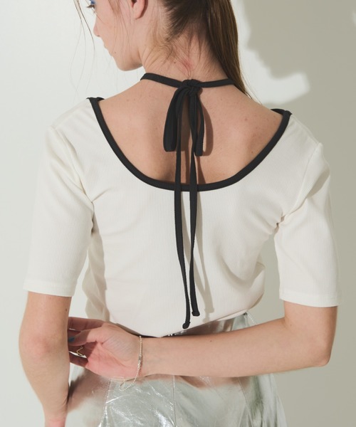 2023 summer collection 【前後2WAY】 ヘルシーな肌魅せが叶う 大人のニュアンス漂うリボントップス POINT ・デザイン性のある首元とリボンの前後2WAYでの着用可 ・柔らかく伸縮性がある素材を使用し 着心地とフィット感のある1枚 ・ハイショクパイピングデザインが目を惹くtops ・シンプルながらもコーディネートのアクセントに ・長めのリボンは結び方次第で雰囲気を変えられます◎ COORDINATE デニムスカートやカラーパンツ合わせで モードで今年らしいスタイルがおすすめです。 シアーシャツやメッシュトップスの インナーとしても活躍します。 また、大きすぎない細見えシルエットなので ハイウエストボトムと合わせると 華奢見え&スタイルアップ効果が抜群です◎ ****************************** 透け感:なし 裏地:なし 伸縮性:あり 光沢感:なし 生地の厚さ:やや薄め 洗濯:手洗い可 ****************************** スタッフ着用コメント 身長161cm/体型:瘦せ型/普段着用サイズ:Sサイズ/着用サイズ:F サイズ感:体にフィットするサイズ感です。 素材感:伸縮性がありとても着用しやすいです。 着心地:柔らかいので肌あたりも良いです。 ※お取り扱いについては、商品についている 品質表示をご確認下さい。 ※画像の商品は光の照射や角度により、 実物と色味が異なる場合がございます。 ※製品によっては染料の特性上 湿った状態や汗をかいた状態での長時間の放置、 または摩擦により、他のものへ 色移りする恐れがありますので、着用時にはご注意下さい。 ■商品のお気に入り登録 お気に入りアイテムの値下げ・再入荷・在庫1点などの 通知を受け取ることができます。 ■ブランドのお気に入り 登録新商品や再入荷、セール、クーポン配布など お得な情報を受け取ることができます。 --------------------------------------------------------------- Solace/ソレイス “MODE”媚びない自分らしいシルエット “CASUAL”シーンレスで手に取りやすいプライス “ART”どこかエッジのある遊び心 トレンドにとらわれず “自分” とマッチするスタイルを提案 ※ご注文いただいた予約商品のお届け時期の確認は、注文履歴ページより行えます。 ※ご注文いただいた予約商品のお届け時期の確認は、注文履歴ページより行えます。