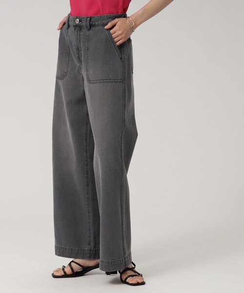 DESIGN POINT ヴィンテージ感のある加工にこだわったワイドフレアデニム。 程よくフレアなデザインで脚長効果を演出してくれます。 前にワーク風パッチポケット、後ろにはスクエア風ポケットで個性を出した一枚です。 今年らしい雰囲気を楽しめるブルー、グレーの2色展開。 ※ポケット数:横×2 後×2 STYLING POINT ジャケットやシャツ合わせで通勤スタイル。 Tシャツと合わせデイリーカジュアルに、デザインカットソーと合わせてモードカジュアルにと幅広く着回せる一枚です。 今年ならワンピースの下に合わせてレイヤーするのもおすすめ。 シーンに合わせて足元を変えることで印象を変えて楽しんで頂けます。 フラットシューズ・ローファー・サンダルなど甲を出すことでスタイルアップするのがおすすめです。 ※裏地なし FABRIC POINT 10オンスの空紡糸で織り上げたデニム素材。 織り方に特徴があり、甘めに織ることで洗い後に引き締まった風合いを出し、ヴィンテージ感を表現したデニムです。 こちらの商品は主に夏に着用いただける商品です。 モデル情報:身長168cm B77 W57 H85 着用サイズ:38 店舗へのお問い合わせ商品番号:523-66024 ●製品寸法: 05(XXS):W67cm H93cm 股下68cm 前股上26cm 渡り幅30cm 裾幅28cm 13(LL):W83cm H109cm 股下77cm 前股上29cm 渡り幅36cm 裾幅32cm 36(S):W70cm H96cm 股下73cm 前股上26cm 渡り幅31cm 裾幅29cm 38(M):W73cm H99cm 股下75cm 前股上27cm 渡り幅32cm 裾幅29cm 40(L):W76cm H102cm 股下76cm 前股上27cm 渡り幅33cm 裾幅30cm 備考: