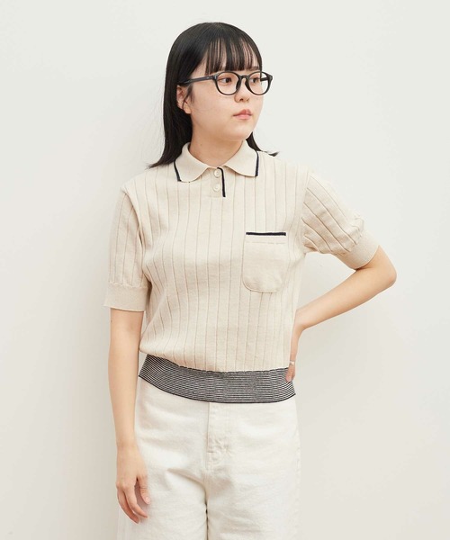 [tsumugu] この素材はオリジナルのリサイクル糸を使用しています。 裁断時に発生する生地の廃棄部分を回収し、細かく裁断・粉砕したのち新しい綿とMIXしてつむぎ、糸を再生しました。 従来破棄する部分から生まれた環境に優しい素材になります。 身頃をリブ組織でストライプ見えにし、リサイクルコットンのネップの表情が懐かしさを感じるレトロな雰囲気に仕上がっています。 衿の配色ラインや裾の細ピッチのボーダーでスポーティな要素をプラスさせたKNITPOLOになります。 型ちがいにレトロクループルオーバー(8701KN002232)もございます。 ※キナリはサンプルです。実際は袖幅が2cm大きくなります。 ------------------------------------------- 〔マックスニット〕 一緒にものづくりをする工場・マックスニットは新潟県の見附市(みつけ市)にあります。 実は新潟県は国内生産シェアが高く、繊維産業が盛んな県。 ”見附”という名前は水に浸かる土地という由来があり、豊かな水源近くにその工場はあります。 真面目さゆえに、普段なら気がつかない細部まできらりと光る技が。 なんだか、「着心地いいなぁ」ってふと思う瞬間。 みえないけれど、さりげないこだわりのつまったニット。 毎日着たくなる、そんなお洋服。 ------------------------------------------- 【素材の特性、お取り扱いの注意】 ・ドライクリーニングは専門店で、セキユ系でお願いします。 ・この製品は素材の組成上糸引きや、ひきつれがおこりやすくなっています。 時計、バッグなど突起物の引っかけや、着用着脱時にはご注意下さい。 ・この製品は、素材の特性上、ピリング(毛玉)が出来る場合があります。 ピリングには、お手入れが必要です。 1日着用したら何日か休ませるなど、ローテーションを考えて着用して下さいます様お願い致します。 ピリングが出来ましたら引っぱって取ろうとせず、小さなハサミで丁寧に取り除いてください。 尚、毛玉取機をご使用の際には、編地を切らないよう充分に注意して下さい。 ・この製品は工場で出た原料の1部に裁断の欠片を利用して紡績したオリジナル糸です。 糸ムラ、ネップ・スラブが入ってる場合がございますが素材の特性上によるものです。 また、洗濯を重ねるたびにネップが目立ちやすくなりますが、他の製品では味わえない雰囲気をお楽しみください。 ※取り扱い表示をよくご確認の上、着用をお願いいたします。 ※撮影画像は、光の当たり具合やモニターの環境により色味が違って見える場合があります。あらかじめご了承ください。 ※サンプル商品は実際の商品と仕様、加工、サイズが若干異なる場合がございます。