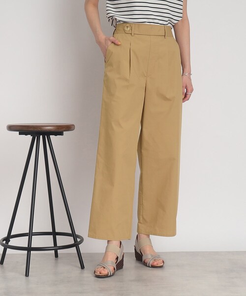 -------------------------------------------------------- カジュアル過ぎず、きちんと見え。楽ちんワイドパンツ! ------------------------------------------------------- 【デザイン】 フロントのタックが入っていることで横に平がりにくく、足がすっきり見えるデザインはワイドをはかれない方にもおすすめ。 ウエストのボタンデザインがワンポイント。カジュアルになりすぎずにお洒落見えします! 後ろゴムではきやすく楽なのに、ゴムがしっかりしているので着脱時のねじれが気にならずストレスフリーが嬉しい。 前からはすっきり見えて、後ろは程よくゆとりがあるのでヒップ周りも安心です。 ※ポケット数:横×2 【スタイリング】 ベージュ(052)とネイビー(093)は綿混素材で程よくハリ感があるのでキレイ目なブラウス合わせでオフィスにも♪ コンパクトなトップス合わせならウエストをインしてボタンデザインを見せるとコーデのアクセントに! 太すぎないワイドシルエットなのでオーバーサイズのトップスや透かし編みニットなど、 ゆったりとしたトップス合わせならアウトスタイルも〇 シンプルなカラー展開なのでボーダーやドットなど柄アイテムとも相性抜群! ロゴTシャツとスニーカーでカジュアルなコーデもおすすめ。 【カラー】 ベージュ(052):お仕事からマリンコーデまで叶う!涼し気なベージュ ブルー(092) :キレイ目なブラウスや華奢なロゴTシャツなど、キレイ目派の方もはきやすいデニム ネイビー(093) :濃紺のカラーなのでお仕事にもぴったりで合わせやすい 【素材】 薄手の綿混素材とデニム素材。 2色綿混素材、1色デニムの3色展開。 ※裏地なし こちらの商品は主に夏に着用いただける商品です。 モデル情報:身長168cm B76 W58 H86 着用サイズ:02(M) 店舗へのお問い合わせ商品番号:741-66028 ●製品寸法: 02(M):W69~93cm H105cm 股下66cm 前股上31cm 渡り幅32cm 裾幅24cm 03(L):W72~96cm H108cm 股下67cm 前股上32cm 渡り幅34cm 裾幅25cm 04(LL):W75~99cm H111cm 股下68cm 前股上32cm 渡り幅35cm 裾幅26cm 備考: