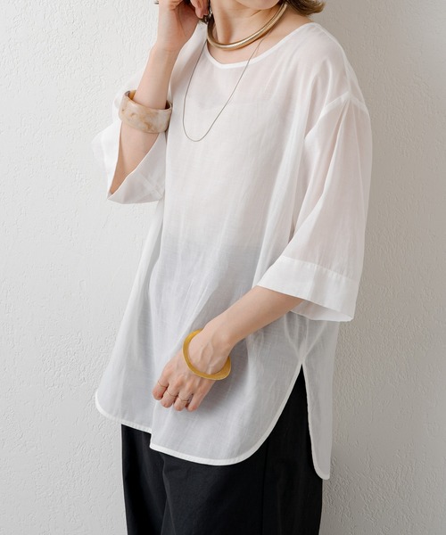 シアー素材が女性らしいシンプルブラウス ・Tシャツのようにさらっと一枚で着て頂けるシンプルなブラウス。シアー素材が女性らしさを引き立ててくれます。 ・シンプルなので合わせやすく、一枚でも様になる一着。キャミワンピやサロペットのインナーにも◎ ・ノーカラーデザインが首回りをすっきりと見せてくれて、アクセサリーや小物が映える一着。 ・透け感:あり ・裏地:なし ・伸縮性:なし ・生地の厚さ:薄手 ・光沢:ややあり ・ポケット:なし <洗濯方法>手洗い洗濯可能 -------------------------------------- ・着用モデル オフホワイト 身長:158cm / 体型:普通 / サイズ:F グリーン、ブラック 身長:160cm / 体型:普通 / サイズ:F -------------------------------------- 【商品のお気に入り登録】 ♡をクリックで気になるアイテムをお気に入り登録していただくと、 以下の通知を受け取ることができます。 ・入荷 ・再入荷 ・ラスト一点 ・セール対象時 【ブランドのお気に入り登録 】 新商品や再入荷、セール、クーポン配布などお得な情報を受け取ることができます。 -------------------------------------- ※商品の色味は、撮影場所や光の当たり具合などにより色味が異なって見える場合がございます。 また、お客様のお使いのPC・スマートフォン等のモニター環境などにより色味が異なって見える場合がございます。予めご了承の上ご注文ください。