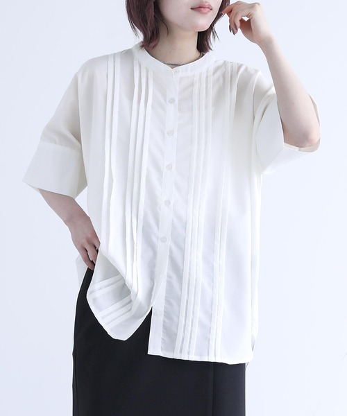 ブラウスとしても羽織りとしても使える、甘くなりすぎない一着。 一部スキマを開けたピンタックが、カジュアルなデザインに仕上げてくれる。バンドカラーで首元はスッキリとした印象に。 二の腕カバーができる長めの半袖丈で、折り返して調節することもできます。 バックスタイルはヨークタック仕様だから、形が崩れにくいのもポイント。 シワになりにくい柔らかなシャツ生地で、さらりとラフに着こなせる。 ≪n'OrLABEL≫ピンタックバンドカラーブラウスです。