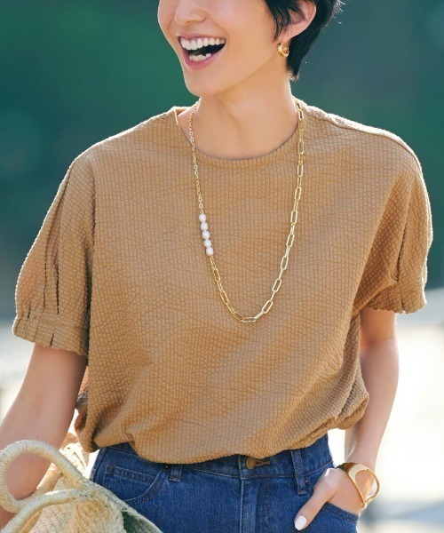 UVカット機能の安心感と凹凸のある表面感+吸汗速乾のさわやかさ 涼やかなサッカー素材のカットソーは、Tシャツ級のらくな着心地。 大人が一枚で着て映えるよう、ぽわんと甘い袖&腰まわりまでカバーするシルエットなど、ディテールにこだわりました。 吸汗速乾素材で着心地はさらりとさわやか。 輝くバックファスナーで後ろ姿の着映え感まで上々です。 プランナーからのコメント ー 生地の厚さ:適度な厚みがあります。 - 透け感:ほとんどありません。 - 伸縮性:カットソーの伸縮性があります。 - コメント:長めの丈感なので、細身のパンツとも合わせやすく、ラウンドヘムなのでフロントインもしやすくスカートやワイドパンツにも合わせやすいです。袖のデザインやバックファスナーで着映えするので、アクセサリーが無くてもOKです。通勤からカジュアルまでオールマイティーに活躍します。