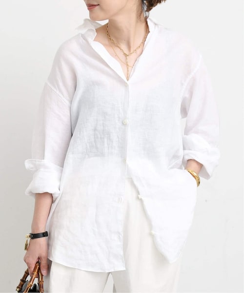 VMID:821526483ラフなムードが漂うヘルシーなリネンシャツ初夏にぴったりのヘルシーなムードを感じさせるリネンシャツは、さらりとしたドライタッチで快適な着心地も魅力。イタリアのシャツ地メーカーの上質なリネン素材に洗いをかけることで、くったりとした程よいラフさが加わり、シンプルなデザインながら襟周りのワイヤーが立体的な顔周りを演出してくれます。ヒップが隠れる長めの着丈で、夏に履きたいショートボトムスとも相性バツグン。トレンドのワイドパンツやリラックスパンツには、軽くフロント部分をタックインしたり、シャツのボタンを外してラフに羽織るとバランスが取りやすくおすすめです。*********************透け感:あり裏地:なし伸縮性:なし光沢感:なし生地の厚さ:やや薄手*********************【スタッフ着用コメント】《STAFF.O》20代後半/身長: 158cm/体型:普通/普段サイズ: M/着用サイズ:フリーサイズ感:程よいゆとり感と前後差のある形が着るだけでシルエットが決まり、おしりが隠れる丈感なので羽織としても安心です。衿にワイヤーが入っているので衿周りがくたらず綺麗に着て頂けます。素材感:麻100%の白なので少し透け感がありますが、ほんのりな透け感のためシアーが苦手な方にも着て頂きやすいです。ウォッシュ加工をかけているので着ていくと付く麻のシワ感も気になりません。着心地:麻なのでサラっとしていて、地肌に着ていただいても涼しく快適です。また手洗い可能なため、汗ばむこれからの季節にも着て頂きやすいです。*********************※取り扱いについては、商品についている洗濯表示にてご確認下さい。※照明の関係により、実際よりも色味が違って見える場合がありますまたパソコン・スマートフォンなどの環境により、若干製品と画像のカラーが異なる場合もございます。※商品の色味は、商品アップ画像をご参照ください。※着用動画はブラウザからのみ閲覧頂けます。モデルサイズ:身長:168cm 着用サイズ:フリー