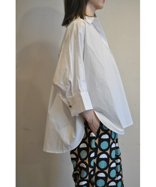ケープ型の5分袖シャツ。 ゆったりとしたサイジングで風通しがよく涼しいアイテムです。 フロントボタンは比翼になっています。 バサッとボリュームを生かしたスタイリングも、ウエストインしてボリュームを押さえても違った印象で楽しめます。