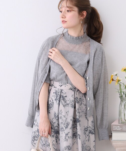 ※508-16045とアンサンブルでの着用も可能です。シアー素材でトレンド感もある、夏にぴったりなカーディガン登場!ほんのりきらめく素材感と、ダブルフェイクパールボタンがきれいスタイルにも◎~POINT~・ダブルフェイクパール釦をデザインアクセントにしたシアードルマンニットカーディガン。・ほんのりきらっと光るような素材感が、涼し気な印象も増して且つ上品に仕上げてくれます。・ほどよくゆったりとしたシルエットは中に着るアイテムを選ばず、万能◎・軽く、持ち運びもしやすいので日よけや冷房対策にもバッチリ。【ディティール・機能】・上品なシアー感でソフトなタッチが特徴の糸を使用しています。【スタッフコメント】・maki(163 )今年トレンドのシアー素材が可愛い、便利なカーディガン。梅雨時期など肌寒いときも、日差しが強いときにも便利です。フェイクパールボタンがアクセサリー代わりになるので、コーデのポイントとして羽織るのも◎さらっとした着心地で、肌触りもいいカーディガンです。モデル情報:身長163cm B81 W56 H82 着用サイズ:38(M)店舗へのお問い合わせ商品番号:508-36020●製品寸法:38(M):着丈56cm B106cm 袖丈67cm42(LL):着丈58cm B113cm 袖丈68cm備考: