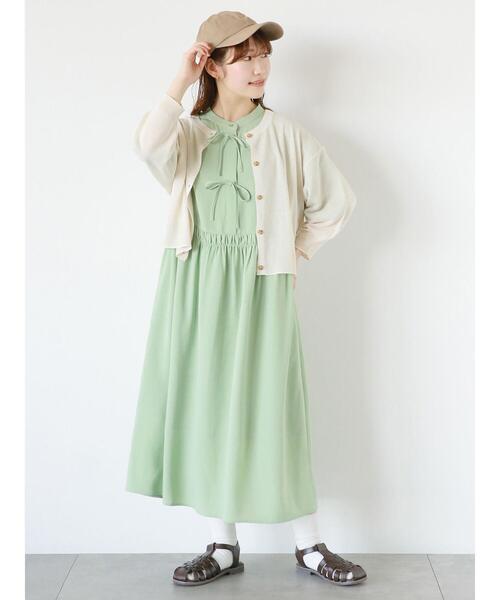 フロントの華奢なリボンが愛らしいアクセントをプラスするワンピース。ふっくらとしたパフ袖やフレアなシルエットで、甘さのあるデザインに仕上げました。上品なバンドカラーもポイント。柔らかな色合いでナチュラルな可愛らしさを演出するアイテムです。 ※商品画像は、撮影環境やお客様のご利用のPC・スマートフォンのモニター環境などにより実物と色味に差異がある場合がございます。