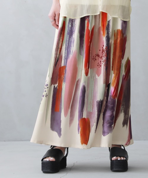 ニュアンス溢れる存在感。 配色×デザインに細かくこだわり抜いたオリジナルの手描きアートプリント。シンプルなアイテムと合わせるだけで、お洒落見えする主役級スカートです。 プリントが際立つ、微光沢のさらりと軽やかな生地を使用。 伸縮性のあるなめらかな裏地付きで、快適に着用いただけます。 今、好きな物、興味あることを自由な発想で表現できる≪ n'OrLABEL ≫。 「実用性と機能性、そして遊び感覚」、多面性を楽しめるピュアでモードなデザインライン。 ≪n'OrLABEL≫アートプリント柄フレアスカートです。