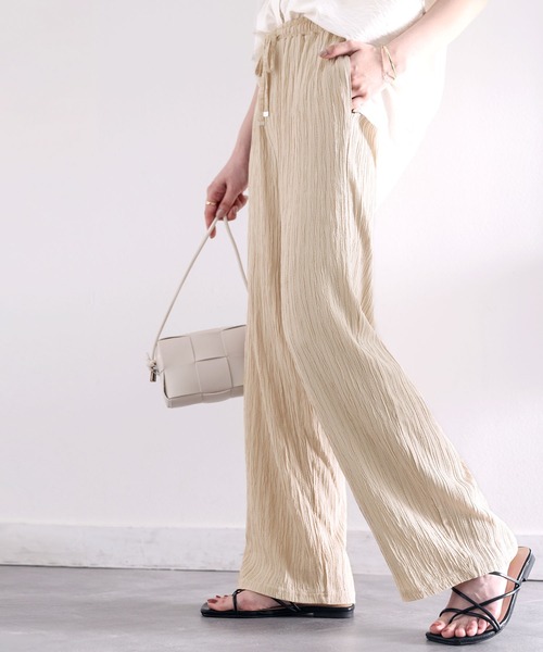 表面感のあるプリーツ素材が特徴的なイージーパンツ。動きの出る上品なシルエットで脚長&スッキリ細見え効果も!落ち感のあるイージーな履き心地でリラックス感と上品さを兼ね備えた一本。■point・縦ストライプ柄・動きやすい・着心地柔らか・涼やか■detail縦ストライプ柄がおしゃれ見え間違いなし、柔らかい生地感でさらっと着られる1枚。ゆったりシルエットで動きやすさもありどんなシチュエーションでも取り入れやすいアイテム◎全体的に細かいプリーツを施しているので、より綺麗なシルエットに見せてくれ美脚効果も抜群!ウエストはゴム仕様になっており、ストレスフリーに着用して頂けます。シルエットを拾わないゆったり感がありながらも、ツヤ感と表情のある生地でキレイめな印象を引き立ててくれます。落ち感のある素材感で、カジュアル過ぎないリラクシーな雰囲気に。■fabric 立体感のある縦ストライプ柄生地。 ……………………透け感:なし厚さ:普通伸縮性:若干裏地:ありポケット:あり洗濯方法:手洗い可 ……………………※詳しいお手入れ方法は商品タグをご参照ください。◾️coordinate縦プリーツに光沢感のある素材が女性らしく上品な印象なのでシアー感のあるブラウスや柔らかな素材感のトップスを合わせるとより一層レディライクにまとまります。夏にはオープンカラーシャツにサンダルを組み合わせた、大人カジュアルなスタイルを楽しんで頂くのもオススメ。ゆるっとした中にもこなれ感のある着こなしが叶います。タンクトップやキャミソールと合わせたヘルシーなコーデはもちろんTシャツと合わせてカジュアルダウンするのもおすすめ◎フェミニンなブラウスやシャツに合わせたきれいめコーデにもハマります。足元はサンダルやスニーカーなど幅広いテイストに馴染むアイテムです。※ご覧のモニター環境により、画像の色味と多少異なる場合がございます。※サイズ表ウエストの()内はウエストゴム最大伸ばし寸となります。★《お気に入り登録》でお得な情報がいっぱい★・「商品のお気に入り登録」で再入荷通知や、ラストの通知、セール通知も受け取ることができます。・「ブランドのお気に入り登録」で新商品や再入荷など、お得な情報を受け取ることができます!