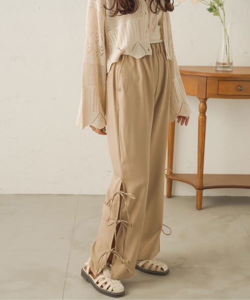 さらっとした素材感で程よいワイド感のストレートパンツ。 サイドに施されたスリットデザインがポイント。 きちんと感にリラックスをプラスしたトレンドスタイル。 両サイドの裾に紐のついたデザインが魅力。 ボディラインを拾わないストンと落ちるストレートで美シルエット&上品な印象に。 ■point ・スタイル盛れ ・両サイドスリット ・着回し抜群 ・上品見え ■detail 両サイドの裾に入ったスリットが女性らしく、 そしてリボンデザインで可愛さをプラス。 ハイウエストになっているので脚長効果もあり華奢見え間違いなし! さらっとした素材感と、程よいゆったりさで楽に着ていただけます。 今の季節からロングシーズンお楽しみいただける、万能アイテムです♪ ■fabric ストレッチが効き柔らかで穿き心地も◎ ウエスト後ろ部分はゴムなのでおなか周りも楽に着て頂けます。 …………………… 透け感:なし 厚さ:普通 伸縮性:あり 裏地:なし ポケット:なし ………………… ※詳しいお手入れ方法は商品タグをご参照ください。 ■coordinate どんなトップスにも合わせやすいよう、アイボリーとベージュの二色展開。 Tシャツやカットソーと合わせればカジュアルな印象に、 シアートップスやブラウスと合わせると上品さのある大人かわいいスタイリングに仕上がります。 ハイウエストなので、ショート丈のトップスと相性が抜群☆ 裾部分のリボンがアクセントにもなるので、シンプルなトップスと合わせるのをおすすめします。 AmbreNeigeとは... “淡色”をベースに心がほっこりするような 暖かみのあるclosetを提案致します。 ※ご注意※ ・屋外の光や照明の当たり具合で、実際の商品の色味とカラー別画像の色味に若干の違いが発生する場合がございます。 ・詳細画像と併せてご確認の上、ご注文いただきますようお願い致します。 ※サイトに表示されているカラー名と実際のお届け商品に記載されているカラー名が異なる場合がございます。 ●お買い物をお得によりお楽しみいただく為に● ▼商品のお気に入り登録&ブランドお気に入り登録▼ がおすすめです! ♡をクリック 完売カラーの再入荷通知や、ラスト1点の通知、プライスダウンしたセール通知も受け取ることができます。 ブランドお気に入り登録もご一緒にお願い致します。