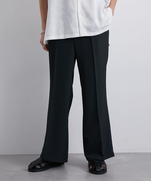 【 Set Up / Unisex 】トロミタックワイドフレアパンツ ワイドフレアスラックスは今年の本命トレンド。シンプルにTシャツでも、シャツをざっくり羽織っても今年顔のスタイリングが出来上がり! ■素材、機能 トロミ感を出しながらもドライタッチで清涼感のある平織り組織の上質な素材です。ツルッとした表面でシワにもなりづらく着用感が抜群です。 ■シルエット、デザイン ゆとりのあるワタリから裾にかけて綺麗なラインで描かれるトレンドワイドシルエットのフレアパンツです。 ウエストバックのゴムがストレスフリーに着用できるのも気の利いた仕様になっています。 ■カラー コーデし易いカラートーンに抑えたブラック、ライトグレー、ブラウン、グリーンの4カラー展開になります。 ■スタイリング トロミシリーズのジレに合わせるセットアップコーデはイチオシ! ドレープ感のある綺麗見えするルーズシャツに合わせて今年らしくシンプルなリラックススタイリングもおすすめ 裏地:なし 透け感:なし(ライトグレーは若干あり) 伸縮性:なし 生地感・厚さ:普通 ポケット:あり その他仕様:なし 【モデル着用サイズ】 MEN1:身長172cm 着用サイズL MEN2:身長175cm 着用サイズL ※撮影場所やライティング、お使いのモニター環境によって色の見え方が異なる場合がございます。 ※商品のカラーは詳細画像の色味をご参照ください。