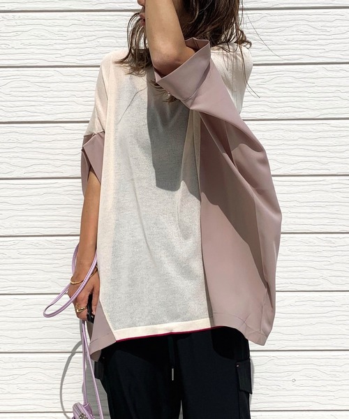 薄手のニットと布帛素材をドッキングしたトップスです。 ドルマンスリーブでリラックスシルエットが抜け感のあるカジュアルさを演出。 サイド部分を異素材ドッキングにすることでメリハリを付けました。 ニット部分の裾はカラーラインを入れてさり気ないアクセントに。 ブラックは同色、ベージュはバイカラーにしているので、全く雰囲気の違う2色に仕上がっています。 レーヨン混の素材を使用しているのひんやりとした接触冷感が期待できます。 《インフォメーション》 ◆商品のお気に入り登録 完売していても再入荷時に再入荷通知を受け取ることができますので、是非ご登録ください。 ◆ブランドのお気に入り登録 新商品や再入荷などの情報を受け取ることができますので、是非ご登録ください。