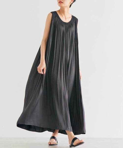 ■デザイン ・前後にたっぷりとギャザーを施し、裾に向かって広がるAラインシルエットのワンピース。 ・ドレスライクな見た目ながらも、肌離れが良くリラクシーな着心地のアイテムです。 ・落ち感のある素材を使用しており、動きに合わせてなびくのもポイントです。 ■素材 ・やや光沢のあるシルキータッチの素材感。 ・ショルダー部分はリネンブレンド素材を使用。 ■カラー 微配色の組み合わせにこだわった2色展開です。 ・チャコールグレー…首周りがブラック、本体はブラックに近いチャコールグレー ・ネイビー…首周りが濃いネイビー、本体は青みの強いネイビー 【洗濯表示】 40℃以下の弱い洗濯機洗い可/酵素系漂白剤可/タンブル乾燥禁止/日陰つり干し/150℃以下のアイロン仕上げ可/石油系ドライクリーニング可 透け感[無し] 裏地[無し] 伸縮性[無し] 光沢感[有り] 生地の厚さ[薄手] 付属品[無し] ポケット[無し] ●製品寸法: M:バスト50.5cm 着丈120cm 肩幅30.5cm 裾幅128cm L:バスト53.5cm 着丈122cm 肩幅32cm 裾幅128cm 備考: