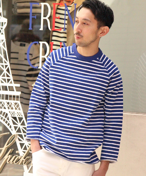EDIFICE(エディフィス) 高密度な圧縮裏毛を使用したボーダーカットソー。定番のボーダーではなく、ラグランスリーブの切り返しで変化を付け、袖はリラックス感のある9ブ丈、カットオフされた袖口と着丈など細部に渡り、アクセントをデザインに落とし込んでいます。ハイブリーチのデニムなどと合わせたマリンスタイルが今季の気分です。