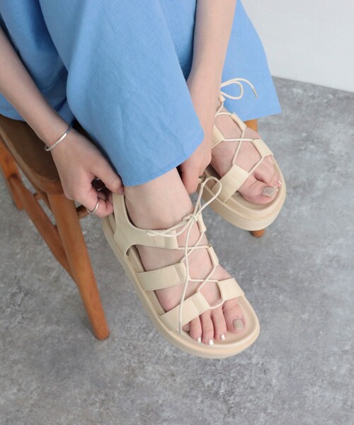◇fredy emue◇【2023 SS】 厚底でトレンドライクなシルエットのレースアップサンダル●point・トレンドの厚底と華奢なレースアップのギャップが存在感を生むお洒落見えサンダル・ボリュームのある厚底がトレンドライクなシルエットで存在感のある1点・トレンド継続中のレースアップデザインが程よく足の甲を見せてすっきりとした印象を与えます・レースアップのみではなくサイドに合皮を使用したデザインなので安定感のある履き心地です・厚底ながら軽い素材を使用しているので重さを感じずに着用いただけます・ソックスレイヤードを楽しんだり、カジュアルなコーディネートの抜け感作りにおすすめです《サイズ》S:約22.5cm~約23cm、M:約23.0cm~約23.5cm、 L:約23.5cm~約24.0cm※生産国やデザインによってサイズが異なりますので、あくまでも目安としてご利用ください。●お取扱い上のご注意●*アテンションタグを必ずご確認の上、着用又はお取り扱い下さい。*店頭及び屋外での撮影画像は、光の当たり具合で色味が違って見える場合があります。商品の色味は、スタジオ撮影の画像をご参照下さい。*商品画像に関しては出来る限り忠実に表示出来るよう努めておりますが、お客様がご利用のモニターの設定及び特性により、実際の商品と比較し色味に若干の誤差が生じる場合があります。◇商品のお気に入り登録◇【お気に入りに登録 ♡マークをクリック】を是非ご活用ください! 再入荷の通知や、ラスト1点の通知、セールの通知がいち早く届きます。◇ブランドのお気に入り登録◇新商品や再入荷など、いち早くブランドのお得情報が届きます。