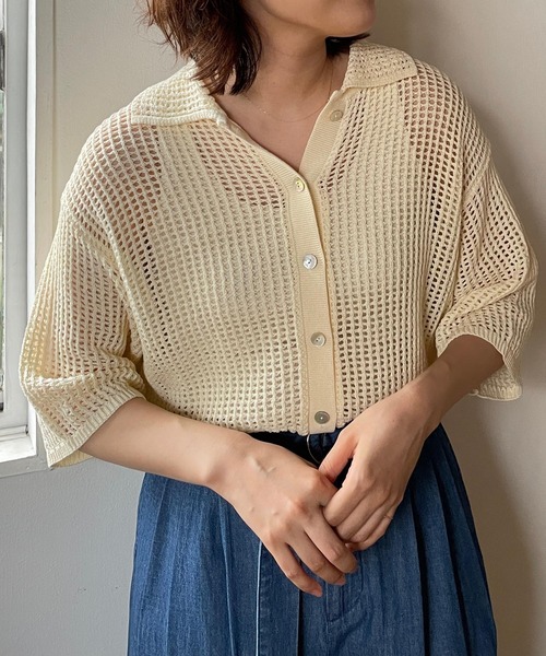 ■素材■ シャリ感のある綿100%を使用しています。 さらっと涼しげな素材です。 ■デザイン■ メッシュ編みで、かつトレンドのポロデザインがポイントのニットカーディガンです。 ボタンを閉じてプルオーバーとして着るのもおすすめ◎ブラックはさりげないラメトリミングがポイントです。 ■スタイリング■ ショート丈なのでワイドシルエットのパンツや、ボリュームのあるスカート合わせがおすすめです。