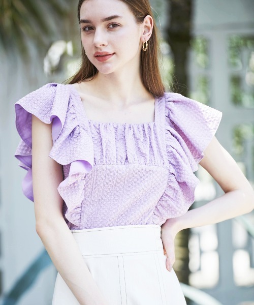 【トレンドライクなふくれジャガードで一気に旬なスタイリングに】【Design/Styling】スクエア開きの襟元がデコルテをキレイに見せてくれるブラウス。ショルダーのフリルが華奢魅せ効果をプラス。コンパクトなブラウスは幅広いコーディネートに使えるアイテムです。【Fabric】立体的なジャガード生地がトレンドライクなマテリアル。表面感のあるブラウスはシンプルなボトムスとも相性◎M:(02):着丈50cm 身幅42.5cm 肩幅25cm