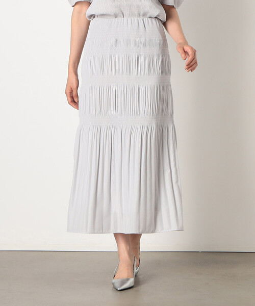 《デザイン》マーメイドシルエットのマジョリカプリーツスカート。ティアードのように段になっているプリーツが膝下から自然に消える事により、フレアシルエットがより一層フェミニンな印象に。ウエスト周りは一周ゴム仕様になっており、着心地は抜群。プリーツブラウスを上下合わせたスタイリングがおすすめ。《素材》ジョリカプリーツはプリーツの中の一種類です。プリーツは熱と薬品で布に折り目(ひだ)をつけることですが、マジョリカプリーツは折り目の部分に変化をつけたプリーツです。変化をつけることによって生地に収縮性がうまれ、軽やかでふんわりとした表情のある表面が特徴です。……………………透け感:なし厚さ:薄手伸縮性:なし光沢感:なし裏地:あり洗濯方法:手洗い……………………#夏コーデ※画像の商品はサンプルとなりますので実際の商品と仕様、加工、サイズが若干異なる場合がございます。※こちらの商品はFIVE FOXes独自の採寸方法となっています。本サイトのサイズガイドと採寸方法が異なる場合がありますのでご了承ください。