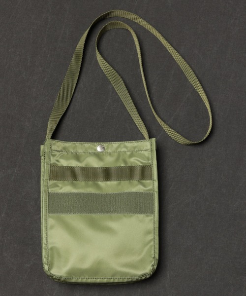 非常にコンパクトな作りながら 3ポケット構造で意外と容量があり 身の回り品ならコレひとつで十分!! 本体サイズ、扱いやすさ、コーディネイトのしやすさなど、 「なんか、ちょうどいい」と思う、ユーザーへの馴染み感を意識した一本です。 ショルダーベルトの長さは120cmに設定。やや低めのポジショニングは、 今っぽさを感じさせる少しルーズ感あるミニショルダーな持ち方を演出できます。 やや高めの位置で持ちたい場合はベルト上部を結んでの調整となり、 ボディバッグポジションにもなります。 その結び目がまたコーディネイトのアクセントにも。 ポーチとしてリュックとの併用なども可能なコンパクトさ。 メインポケットが三層構造になっており、長財布が縦にすっぽり入る大きさ。 普段の身の回り品を振り分けしやすく、そして中身へのアクセスしやすいのも特徴です。 しかもこのバッグは両面表として使えるデザイン。フライトジャケットでよくある 面ファスナーの受けを配したデザインした面はよりミリタリー感を強めに、 そしてもう一面はタグのみのシンプルなルックス。 実際に服に合わせてみるとだいぶ印象が変わるので、 その日の気分や服装に合わせてコーディネイトを楽しむことができます。 MA-1に代表されるフライトジャケットを彷彿させるタフな雰囲気を、 シンプルな構造とスマートなシルエットで仕上げたファッションピースです。 ミリタリーテイストは、常に自身のファッションイズムの側にあり、 長年好きなスタイルのひとつ。しなやかで耐久性のあるナイロン素材は、 特有のハリ感とやや抑えめなシャイニー感により、 上品な印象さえも感じさせる仕上がりになっています。 そして、フライトジャケットやミリタリーアイテム同様、 使う人の使用具合によるシワ感、折れなどによって落ち着いた雰囲気に変わり、 パーソナルな経年変化と共に重厚感がバッグに反映され、 育てる、愛着の沸くバッグとしての一面も持っています。 【30日間のモニタリング】フライトジャケット特有の滑らかな肌触りが気持ちいい。 約2週間程度で全体が馴染んできて、素材の光沢感が多角化し、落ち着いた感じに 変わってきました。軽いし、とにかく使い勝手がラクチンです。 キーケースなど落としたくないものは、ホックボタンのポケットを活用しています。 *希に摩耗や汗、雨、水濡れ等で色落ち、色移りする場合がございますので、濡れたまま白色等の服装時には長時間密着させないようご注意下さい。また他ビニール等と長時間密着、密閉は避け、適度に風通しのある場所にて保管願います。化粧品類などによる化学変化が起きる場合がございます。多少の折り線、凹凸、シワ等がランダムで入る場合がございますが、素材ならでのものでございますのでご理解・ご了承下さい。カラー、素材の生産時期により、若干ではありますが素材の織りの硬さ、ハリ感が変わりますが品質には問題ございませんので、ご理解の上ご使用のほど宜しくお願いいたします。